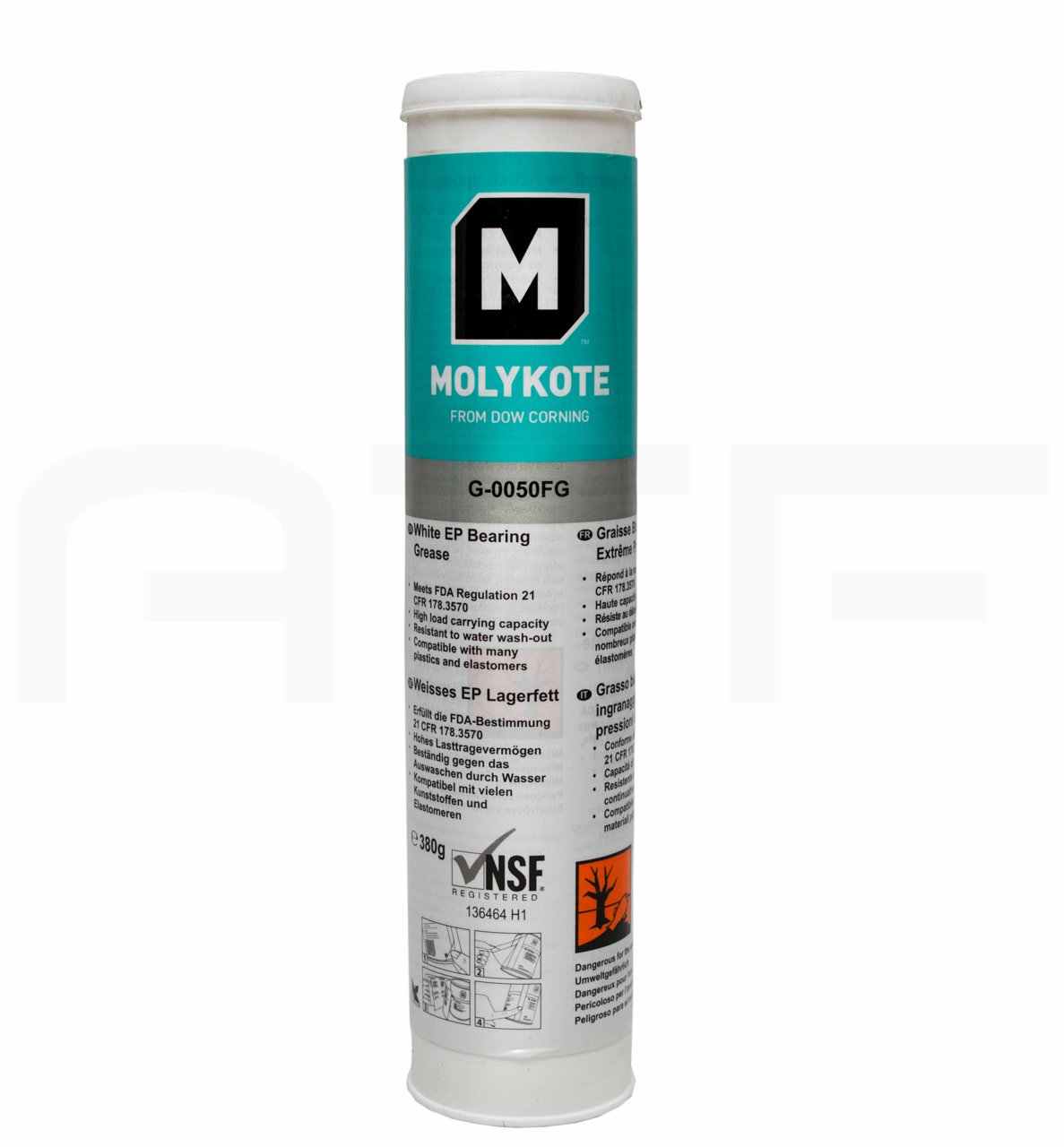 Пластичный смазочный продукт на базе минерального масла и комплексного алюминиевого загустителя. В составе применен антифрикционный наполнитель – оксида цинка, противозадирные и противоизносные присадки. Molykote G-0050 имеет допуск NSF H1. Отличается высокой несущей способностью и устойчивостью к вымыванию водой. Применяется для тяжелонагруженных узлов трения пищевого оборудования, которое работает в температурных условиях -17...+150 °С.