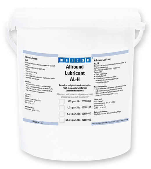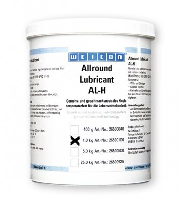 Пластичная смазка 1-го класса консистенции для пищевой отрасли. Изготовлена на основе полиальфаолефина и комплексного алюминиевого загустителя. Имеет пищевой допуск HSF H1 и немецкий сертификат безопасности LMBG. Weicon AL-H не имеет вкуса и запаха, допускается попадание в пищу в количестве не более 0,01%. Используется в условиях повышенной влажности, контакта с водой при температурах -30…+120 °C.