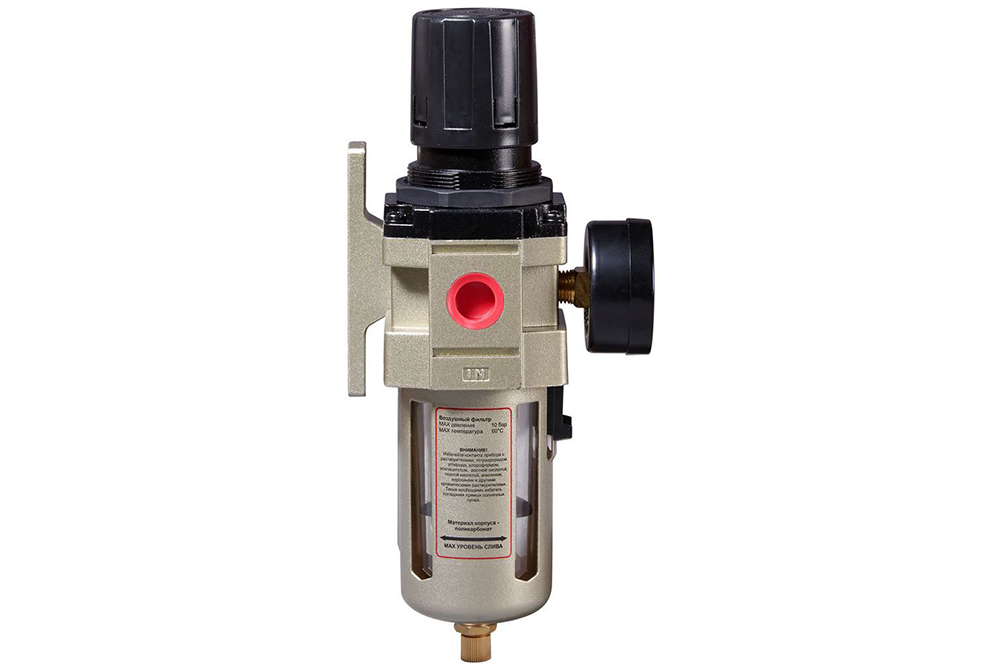 • Блок подготовки воздуха FRL 1700. Представляет собой прибор для очистки воздушных масс, подаваемых в пневмоинструмент, от пыли, капель воды, мелких частичек и прочих загрязнений. Блок включает в себя фильтр и лубрикатор, а также встроенные манометр для определения давления воздуха. Разъемное соединение на входе – 1/4". Материал корпуса – поликарбонат. Максимально давление – 10 бар. Пропускная способность – 4000 л/мин.