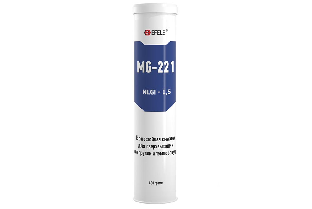 Российская компания «Эффективный элемент» предлагает широчайший выбор качественных смазочных материалов, в частности — EFELE MG-221. Дисперсия пластичной консистенции включает минеральное масло и комплекс на основе сульфоната кальция в качестве загустителя. Продукт применяется на подшипниках качения, скольжения, направляющих скольжения и качения, шлицевых шпоночных соединениях.