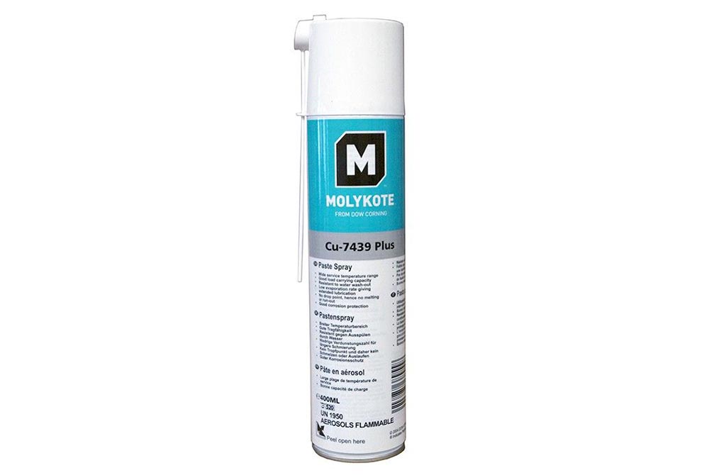 Molykote Cu-7439 Plus – смесь на основе полусинтетического масла и высокодисперсного медного порошка. Предназначена для деталей, подверженных термическому воздействию и коррозии. Материал отличается хорошей несущей способностью, адгезией, устойчивостью к смыванию, низким испарением и отсутствием точек каплепадения. Задействуется для обработки подшипников, элементов запорной арматуры, сальниковых узлов, шарниров, резьбовых соединений электротехники и механики, фланцевых соединений и т.д.