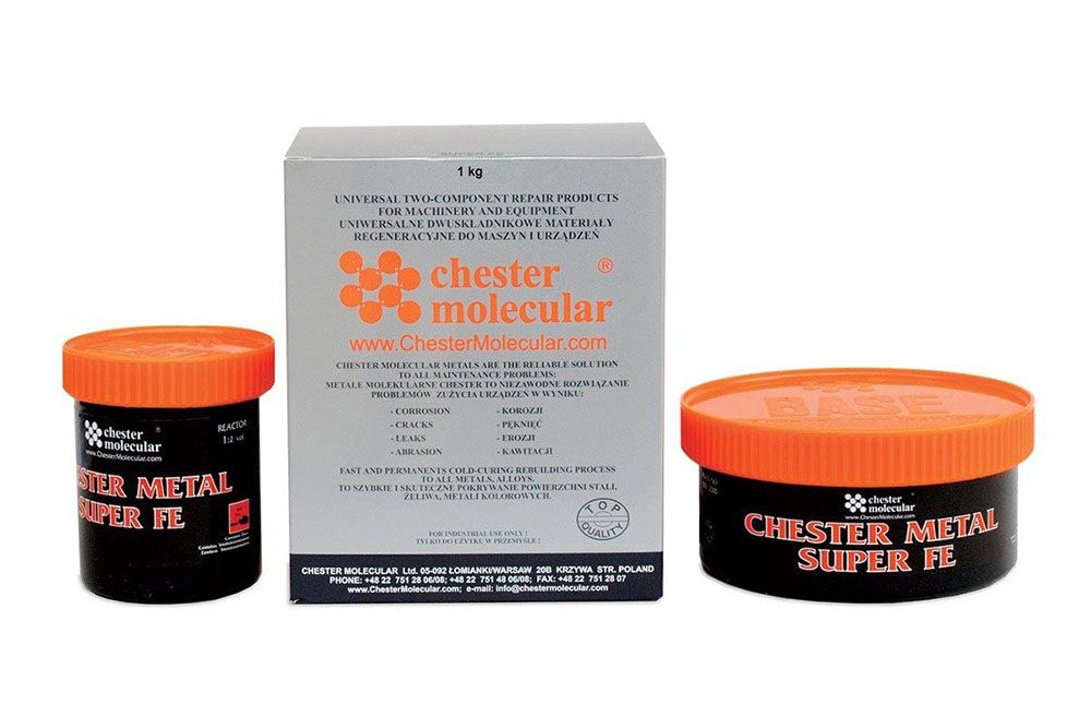 Металлополимеры Chester Molecular – двухкомпонентные системы, используемые для выполнения ремонтных работ без длительной остановки рабочего процесса. После смешивания веществ, поставляемых в отдельных тарах, происходит химическая реакция – образуется высокопрочный ремонтный материал. Он имеет хорошую адгезию с черными и цветными металлами, некоторыми видами пластика, бетоном.