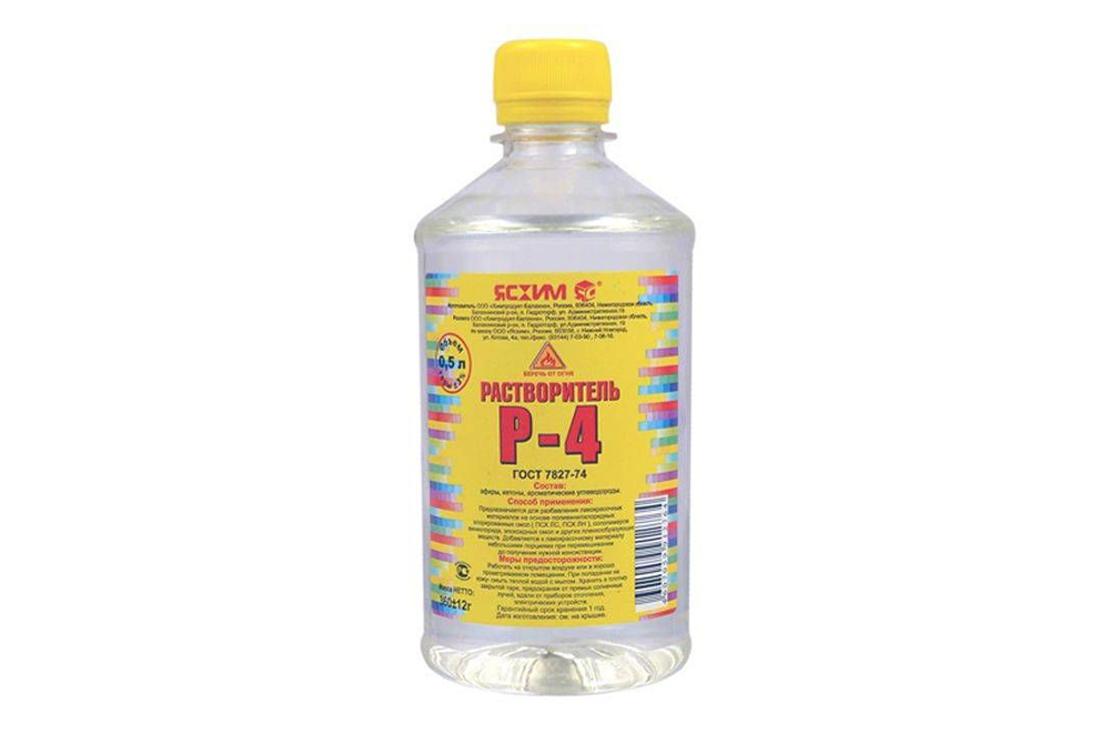 Р-4 – универсальный состав органического происхождения, прозрачный или светло-желтого цвета. Преимущество растворителя в том, что его можно смешивать с любыми лакокрасочными составами.