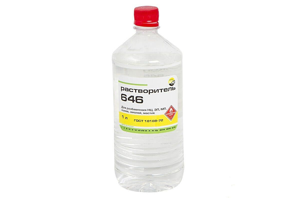Растворитель 646 – это прозрачная желтоватая жидкость, в процессе хранения которой осадок не образуется. Самовоспламеняется при 403°C, точка кипения – 59°C. Плотность – 0,87 г/см3. Состав не замерзает, после него не остается матовых разводов.