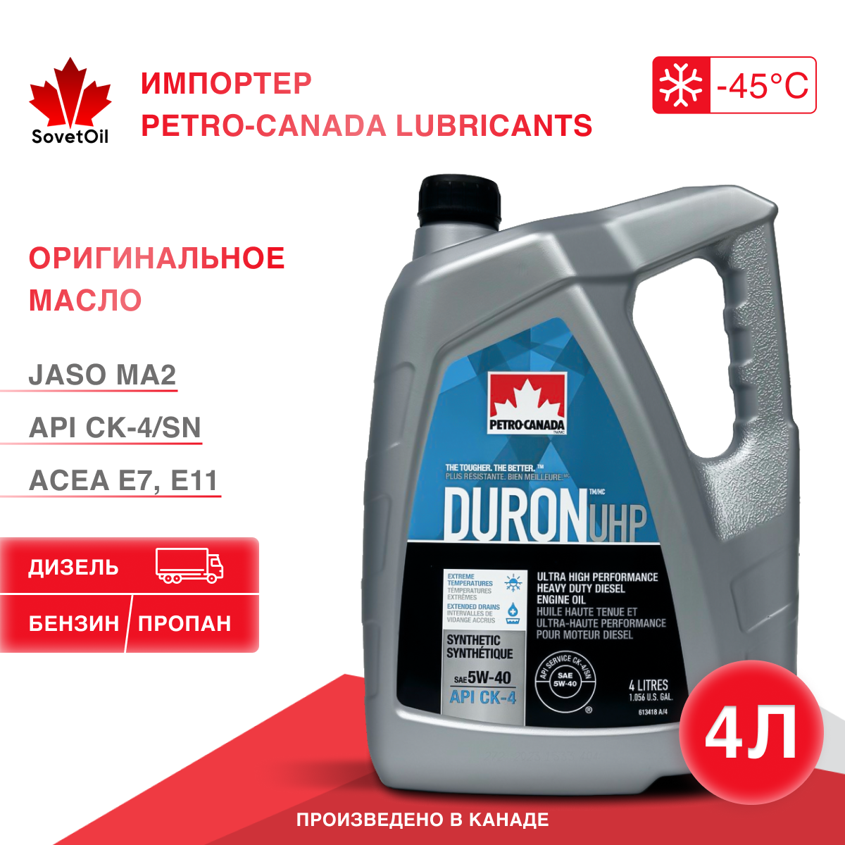 Масло оригинальное, 2023г. выпуска, страна происхождения Канада. Наша компания импортер возобновила поставки в Россию на регулярной основе. Вся продукция прошла все необходимые процедуры таможенной очистки с уплатой соответствующих пошлин, акцизных сборов и НДС в размере 20%, признана соответствующей техническому регламенту Таможенного союза.Для поддержания регулярности отгрузок и сохранения каналов поставок с 1 сентября наша компания вынуждена удалять с некоторых продуктов информацию о номерах партий и логистических штрих-кодах. Наша компания гарантирует подлинность и качество продукции, которую мы предлагаем. Мы готовы взять на себя полную юридическую ответственность за качество продукции и подтвердить его в независимой международной лаборатории, если потребуется.Моторное масло PETRO-CANADA DURON UHP 5W-40 это сверхэффективное, полностью синтетическое моторное масло для тяжелых условий эксплуатации, которое обеспечивает превосходную защиту и эффективность, особенно в условиях низких температур. Благодаря облегченному пуску в холодную погоду, пониженному вязкостному сопротивлению и прочной масляной пленке оно помогает экономить энергию и снижает износ двигателя. Его превосходная прокачиваемость, устойчивость при сдвиге, отличный контроль износа двигателя и низкая частота долива масла повышают эксплуатационную эффективность без ухудшения защиты двигателя. Сочетание базовых масел со степенью чистоты 99.9% и специальных присадок помогает уменьшить время простоя и повысить надежность двигателей. Базовые масла с высоким индексом вязкости и модификаторы вязкости, устойчивые к сдвигу, помогают сохранять вязкость масла, снижают износ двигателя и обеспечивают улучшенную защиту на протяжении всего срока службы масла. Сверхчистые базовые масла неизменно высокого качества снижают уровень шлама в двигателях и отложений в верхних канавках поршней, благодаря чему двигатели работают как новые. Эффективное диспергирование твердых частиц и сажи при одновременном контроле увеличения вязкости.