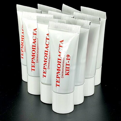 КПТ-19 (Кремнийорганическая Паста Теплопроводная)Высоковязкая теплостойкая серая масса невысыхающаяТеплопроводная паста.Кремнийорганическая КПТ-19 служит для увеличения теплопередачи между соприкасающимися поверхностями (для процессоров, для транзисторов, для электронных приборов, где требуется теплоотвод и есть опасность перегрева при нормальной работе).Цвет: серая паста без включенийТеплопроводность Вт./(Мк): 0.8-1Удельное сопротивление Ом/см: 1011Электрическая прочность кВт/мм: 2-5Тангенс диэлектрических потерь при 10 МГц: 0.005Рабочие температуры от -60 до +180ГОСТ 19783-74Инструкция: нанести нужное количество пасты на поверхность, примкнуть плотно радиатор.Рекомендация: старайтесь применять пасту более тонким слоем - это обеспечит лучшую скорость отвода тепла. Излишки пасты удалить.