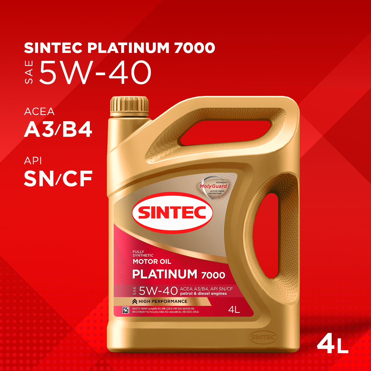 SINTEC PLATINUM 7000 5W-40 A3/B4 производится из синтетических базовых масел и высокоэффективного многофункционального пакета присадок. Синтетические базовые масла обеспечивают отличные низкотемпературные и термоокислительные свойства, что обеспечивает лёгкий пуск в самых суровых погодных условиях и увеличенный интервал замены масла, даже при высоких нагрузках на ДВС. Противоизносные и моюще-диспергирующие присадки последнего поколения гарантируют непревзойдённую защиту и чистоту двигателя на весь срок службы масла.