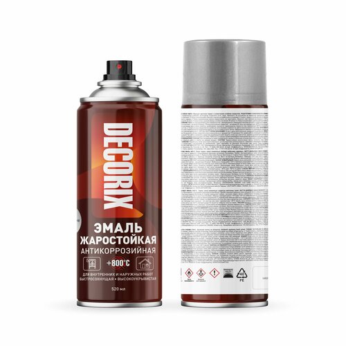 Высококачественная жаростойкая эмаль DECORIX предназначена для окрашивания поверхностей, подверженных нагреванию до температуры +800°С, а также для бытового применения, декоративно-оформительских работ, строительства и ремонта.Применяется для окрашивания мангалов, грилей, барбекю, печей в банях и саунах, каминов, котельного оборудования, паропроводов с перегретым паром, печных труб, водонагревательного оборудования, выхлопной системы автомобиля, деталей двигателя, суппортов тормозов и т. п.Аэрозольная эмаль удобна для окрашивания небольших поверхностей и труднодоступных мест.