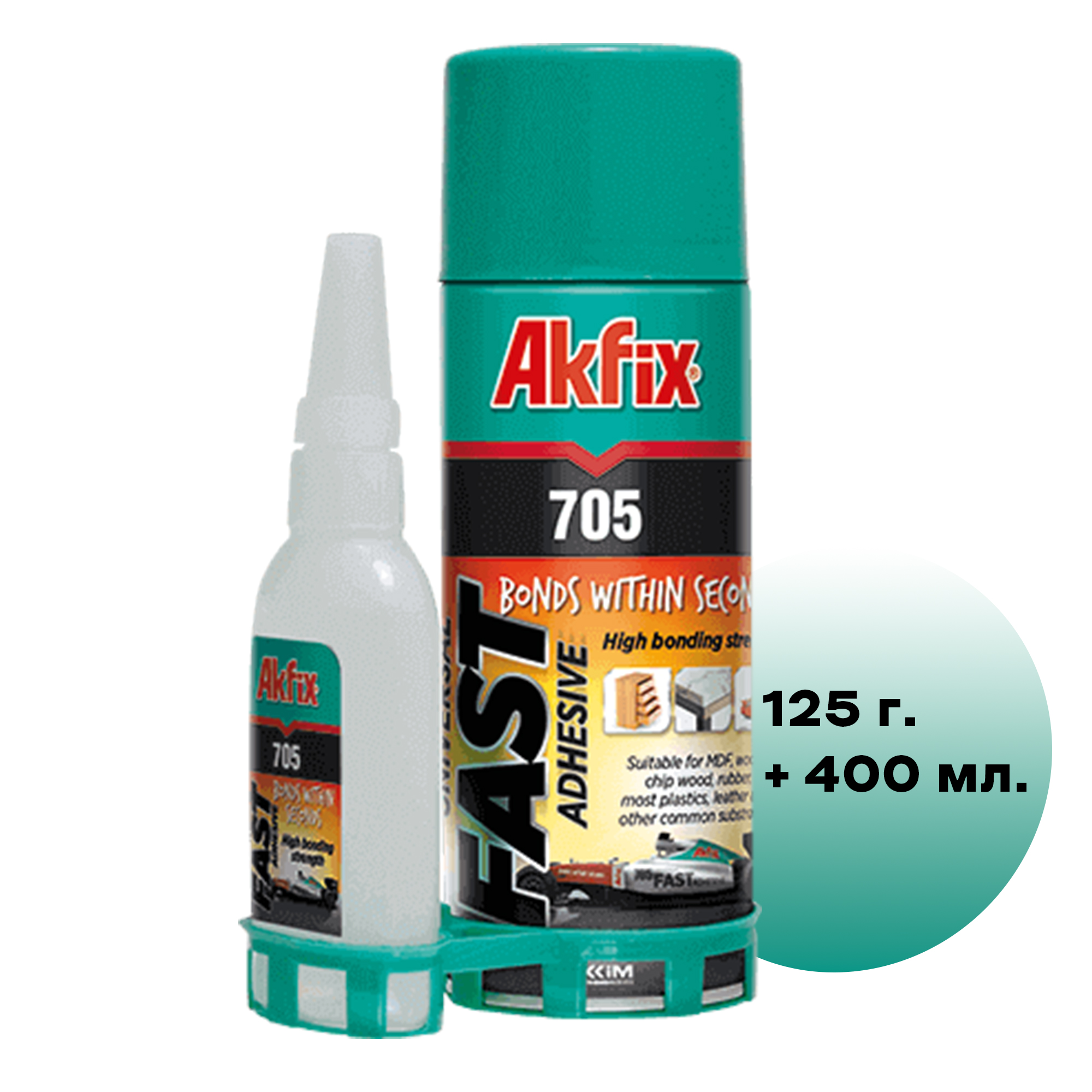 Akfix 705 Набор для склеивания 125 гр. + 400 мл. арт. AN705_125Akfix 705, набор, состоящий из быстро полимеризующегося клея высокой вязкости на цианокрилатной основе и аэрозоля-активатора.свойстваСвойства: Высокая прочность склеивания. Идеален для использования на вертикальных поверхностях не капает и не стекает. Особенно подходит для склеивания различных материалов,пористых по структуре или с шероховатой поверхностью.Область применения: В основном применяется для монтажа и ремонта деревянных деталей. Подходит для МДФ, дерева, резины, большинства пластиков, кожи и т.д. Активатор необходим для ускорения процесса склеивания.