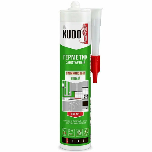 Предотвращает появление плесени.Устойчив к УФ излучению, воздействию чистящих и моющих средств.Отличная адгезия к эмалированным поверхностям, стеклу, нержавеющей стали, анодированному алюминию, дереву, ПВХ, фарфору и другим строительным материалам.Имеет широкий температурный диапазон эксплуатации: от –40°С до +180°С.Время образования поверхностной плёнки — 10–20 мин, скорость отверждения герметика — 2 мм в сутки (при температуре +23°С и относительной влажности 50%).На 20–22 погонных метра при диаметре валика 4 мм.Высококачественный силиконовый герметик KUDO® с системой отверждения ацетокси применяется при общих бытовых, ремонтных и строительных работах. Cодержит специальные антисептические добавки, препятствующие образованию плесени и грибков. Идеально подходит для помещений с повышенной влажностью: ванных комнат, душевых кабин, кухонь, для остекления и т. д. Применяется для уплотнения соединительных швов вокруг ванн, раковин, бассейнов; герметизации стыков при установке сантехнического оборудования, гидроизоляции поверхностей, заделки швов между плитками. Силиконовый санитарный герметик KUDO® отлично подходит для герметизации швов в ванной.Обладает высокими эксплуатационными характеристиками: образует прочный долговечный шов, после отверждения сохраняет деформационную подвижность до ±25%, не собирает пыль, устойчив к воздействию большинства моющих и чистящих средств, стоек к УФ излучению, атмосферным воздействиям, температурным перепадам и практически любым агрессивным средам. Быстро покрывается плёнкой. Тиксотропный, не растекается и не сползает по шву.Работы рекомендуется проводить при температуре от +5°С до +40°С, температура герметика должна составлять +20…25°C.Герметик наносить на чистые, сухие и обезжиренные поверхности.Для аккуратного выполнения работ защитить поверхности малярной лентой.Отрезать винтовую головку тубы над резьбой, навинтить наконечник, открутить колпачок и срезать носик под углом 45° по диаметру, соответствующему ширине шва.Для нанесения использовать строительный пистолет.Разгладить герметик в шве влажным шпателем. Удалить малярную ленту сразу после выравнивания.Инструменты и запачканные поверхности очистить до отверждения герметика при помощи растворителя (ацетон, уайт-​спирит).Затвердевший герметик удалить механическим способом.Не рекомендуется применять герметик в контакте с природным камнем (мрамор, гранит), на металлических поверхностях, подверженных коррозии (свинец, медь, цинк, латунь), на бетонных, цементных, оштукатуренных поверхностях и при работе с зеркалами. Не использовать для уплотнения аквариумов и подводных швов. Не окрашивать!