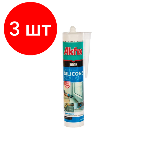 Комплект 3 штук, Герметик силиконовый универсальный Akfix 100E, белый, 280 мл (SA042)