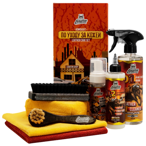 В комплект входит:Очиститель кожи LERATON D1 473 мл. Нейтральный состав для очистки кожаных изделий. Легко и без усилий убирает даже самые сложные загрязнения. Глубоко очищает поры кожи от грязи, пыли, налета, не нанося вреда поверхности. Придает свежий внешний вид, восстанавливает естественную мягкость.Крем-кондиционер для кожи LERATON D2 200 мл. Состав на основе водномасляной эмульсии. Великолепно очищает загрязнения с кожаных поверхностей, благодаря специальным компонентам питает кожу, придавая ей мягкость, эластичность и естественный оттенок. Быстро впитывается и защищает поверхность. Обработанная кожа не скользит и не липнет. Обработанная поверхность обладает антистатическими свойствами.Щетка для чистки кожи LERATON BR1S. Деревянная щетка с искусственным ворсом средней жесткости подходит для работы с любыми типами кожи. Ворс не выпадает и не царапает кожаные изделия даже самой нежной выделки.Малая щетка для чистки кожи из натуральной щетины BRM. Эргономичная щётка из натуральной щетины для очистки стыков и других труднодоступных мест на кожаных поверхностях. Натуральный мягкий ворс BRM подходит для работы с любыми типами кожи, даже самой нежной выделки. Высокая плотность волокон позволяет равномерно очищать поверхность. Ворс не выпадает и не царапает кожу. Ручка щётки изготовлена из натурального дерева и обработана специальным воском, что делает щетку долговечной и устойчивой к щелочным очистителям. Микрофибровый аппликатор LERATON MF11 Leather. Мягкий поролоновый аппликатор, обтянутый микрофибровой тканью. Предназначен для нанесения консервирующих составов при работе с интерьером. Микрофибровое волокно не царапает поверхность и не дает составам проникнуть глубоко в аппликатор, тем самым уменьшая расход средства.Микрофибровая салфетка LERATON Terry Leather (2 шт) MFLS 37x37 х 1 комплект.Бутылка-пенообразователь. Прозрачная пластиковая бутылка с механическим пенообразователем. Предназначена для вспенивания очищающего средства, налитого внутрь. Рекомендуется использовать при очистке кожи в салоне автомобиля.