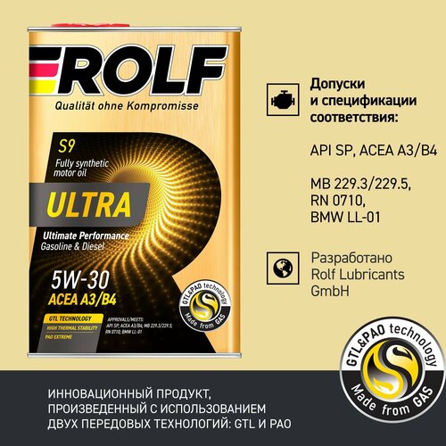 Полностью синтетическое моторное масло «Rolf Ultra SAE 5W-30 ACEA A3/B4 API SP/CF» изготовлено из высококачественных синтетических базовых масел (GTL + PAO) и многофункционального пакета присадок.