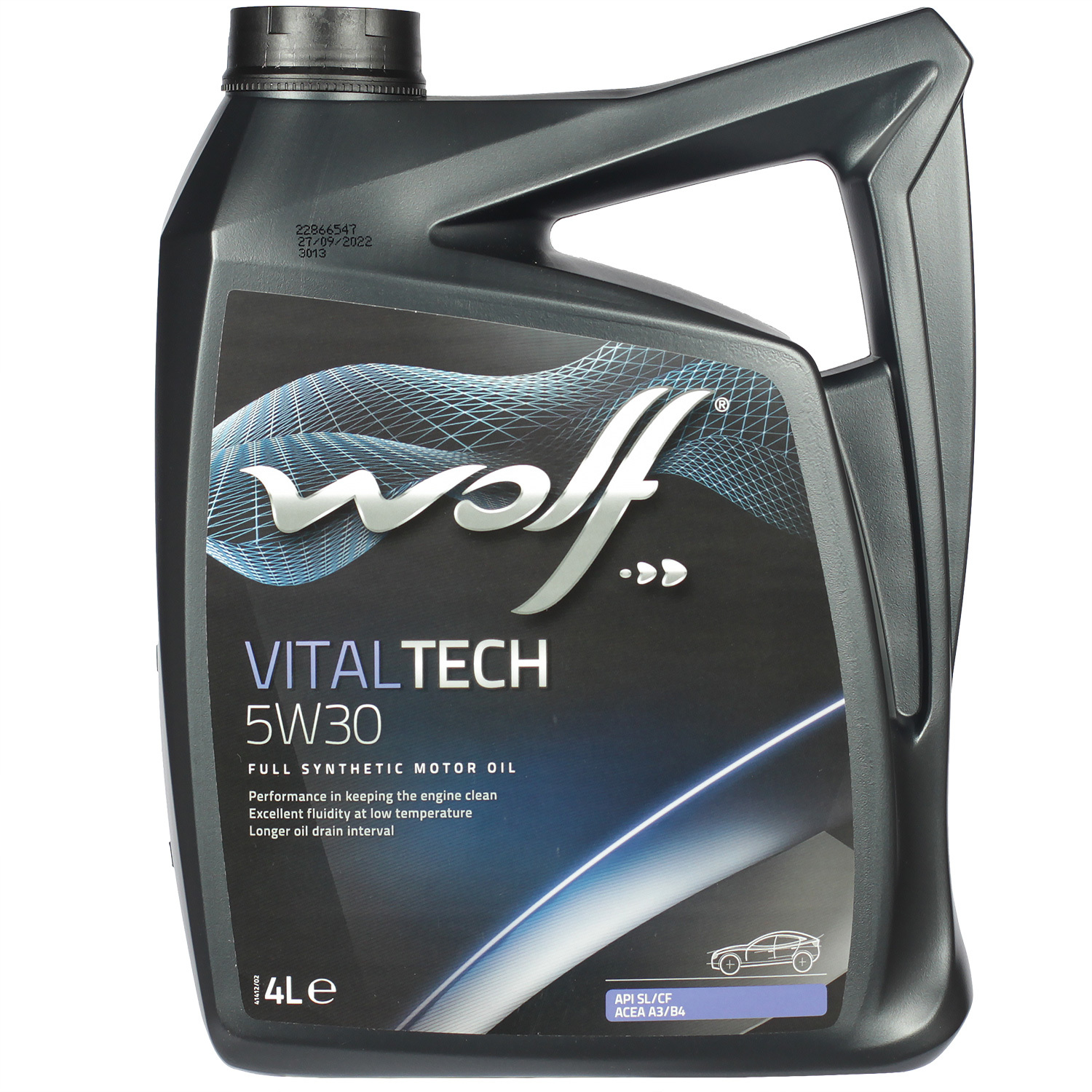 Wolf VitalTech 5W-30 — высококачественный полностью синтетический смазочный материал, разработанный по эксклюзивной технологии на основе тщательно отобранных базовых составов и многофункционального пакета присадок. Подходит для дизельных и бензиновых двигателей — многоклапанных, с турбонаддувом, без сажевых фильтров легковых и малотоннажных грузовых автомобилей.