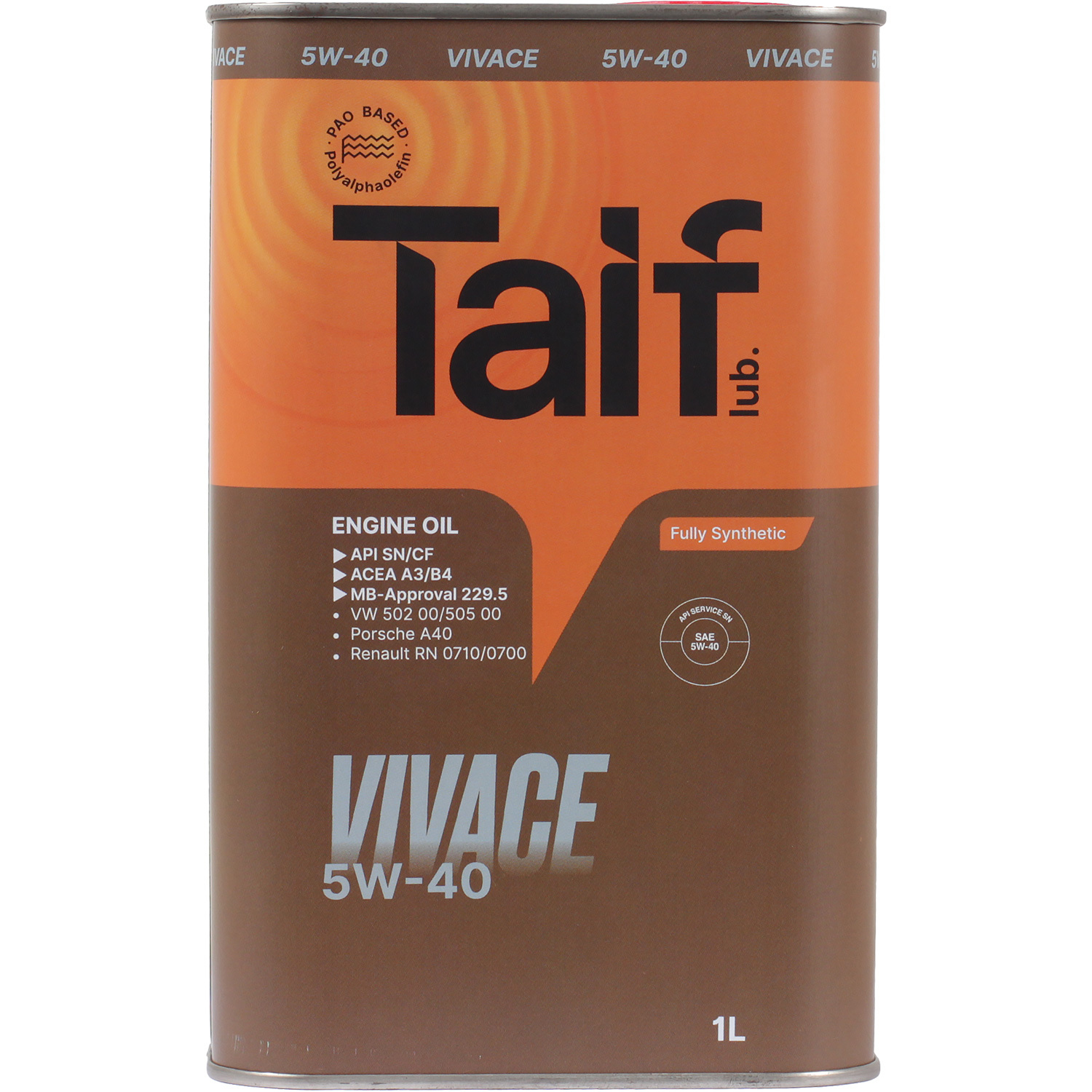Taif Vivace 5W-40 — это универсальное всесезонное моторное масло, разработанное по уникальной синтетической технологии на основе полиальфаолефинов специально для бензиновых и дизельных двигателей легковых автомобилей, микроавтобусов, малотоннажного коммерческого транспорта.