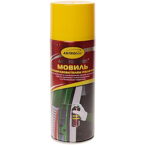 Мовиль с преобразователем ржавчины ASTROHIM 520 мл аэрозоль - предназначен для антикоррозийной защиты скрытых полостей кузовов автомобилей со значительным сроком эксплуатации: дверей, порогов, лонжеронов и т. д. Образует покрытие с выраженными гидрофобными свойствами, глубоко проникает в очаги ржавчины и останавливает коррозию. Допускается наносить на влажную и ржавую поверхность, а также на старые антикоррозионные покрытия. Не оказывает отрицательного влияния на лакокрасочные покрытия, резину и пластик.Применение:Энергично встряхнуть баллон перед использованием в течение 2-3 мин.Состав наносить, используя прилагаемую трубочку, которая обеспечивает равномерное распыление в скрытых полостях.При использовании мовиля на наружных поверхностях, состав наносится без использования трубочки.Температура нанесения – от +10 до +30 °C.Перед нанесением состава поверхность необходимо очистить от грязи и рыхлых слоев ржавчины.Во избежание попадания следов состава на поверхности, не подверженные обработке, рекомендуется защищать их.При необходимости следы мовиля можно удалить с помощью очистителя.Во избежание засорения головки распылителя рекомендуется по окончании работы перевернуть баллон вверх дном и распылять до тех пор, пока не станет поступать чистый газ.Меры предосторожности:Состав использовать в хорошо проветриваемом посещении.Обязательно применять средства индивидуальной защиты органов зрения (очки), дыхания (респиратор) и кожи (перчатки).При попадании на незащищенные участки тела, состав можно смыть при помощи воды с мылом или растворителя (например, уайт-спиритом).При попадании в глаза – тщательно промыть их чистой водой и обратиться к врачу.Содержимое под давлением.Беречь от попадания прямых солнечных лучей и не нагревать выше +40 °C.Не вскрывать и не сжигать после использования.Не вдыхать испарения.Огнеопасно!Не курить во время использования.Хранить и транспортировать допускается при температуре от -50 до +40 °C.Хранить в хорошо проветриваемом помещении вдали от источников тепла, искр и открытого огня.Беречь от детей.Состав: суспензия частиц твердых алканов более 30%, ингибиторы коррозии менее 5%, гидрогенизированные тяжелые дистилляты нефти 5-15%, органические растворители 5-15%, озонобезопасный углеводородный пропеллент более 30%.Объем/вес: 520 мл (аэрозоль)
