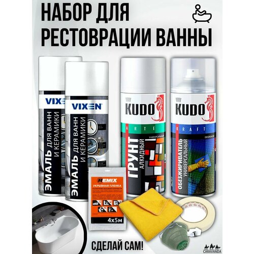 Набор для реставрации Ванной, чугунной, акриловой, стальной. 2 Баллона белой Эмали, Грунт алкидный белый, Обезжириватель, укрывная пленка, скотч малярный, микрофибра и Перчатки в подарок. На 3 картинке есть инструкция к применению. Vixen Эмаль для ванн и керамики VX-55002 аэрозоль, 520 мл - идеальное решение для восстановления поврежденных эмалевых покрытий и керамики. Высококачественный алкидный универсальный грунт KUDO предназначен для подготовки к окраске металлических и деревянных поверхностей всеми видами лакокрасочных материалов. Обладает высокой адгезией, атмосферостойкостью и хорошей укрывистостью. Аэрозольная алкидная грунтовка легко наносится на труднодоступные места, образует на окрашиваемой поверхности прочное покрытие. Высококачественный состав на основе неагрессивных растворителей. Обезжириватель KUDO KU-9102 применяется при подготовке различных деталей к окрашиванию для очистки и обезжиривания поверхности с целью обеспечения необходимой адгезии лакокрасочных материалов и получения однородного покрытия без кратеров, пор и морщин. Способствует увеличению срока службы покрытия. Активные компоненты состава эффективно удаляют силикон, масляные и жировые загрязнения, смазочные материалы, воск, грязь, нагар.