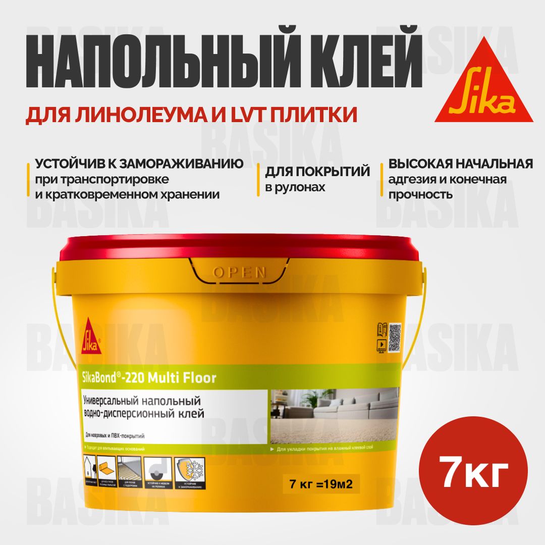 SikaBond®-220 Multi Floor однокомпонентный водно-дисперсионный клей для ковровых и ПВХ напольных покрытий SikaBond®-220 Multi Floor предназначен для приклеивания напольных покрытий на впитывающие основания внутри помещений: - ПВХ покрытия в рулонах - виниловые - ковровые покрытия на синтетических и натуральных подложках - для бытового и полукоммерческого применения ХАРАКТЕРИСТИКИ / ПРЕИМУЩЕСТВА ? Приклеивание на впитывающие влагу основания ? Для покрытий в рулонах ? Высокая начальная адгезия и конечная прочность ? Для укладки покрытий на влажный клеевой слой ? Для теплых полов и под мебель на роликах ? Устойчив к замораживанию