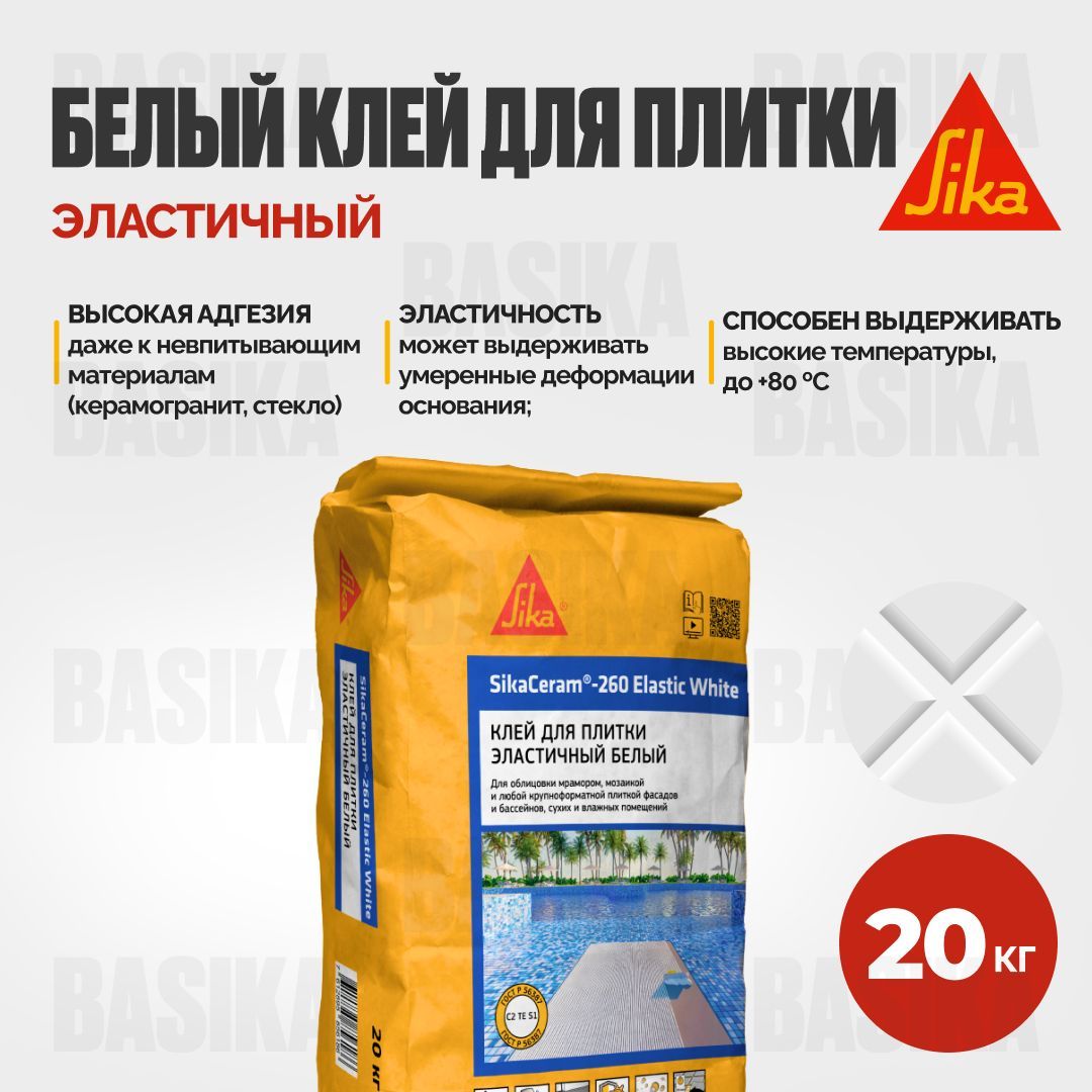 SikaCeram®-260 Elastic White – эластичная клеевая смесь белого цвета, предназначенная для укладки любого типа плитки из керамогранита, тонкого керамогранита, усиленного сеткой (керлит), керамики и натурального и искусственного камня, крупного и сверхкрупного формата размером от 60х60 см (160х20 см, 300х100 см, 320х160 см и т.п.), а также стеклянной и керамической мозаики. Клеевая смесь SikaCeram®-260 Elastic White предназначена для облицовки стен и полов в жилых и промышленных помещениях, внутри и снаружи зданий и сооружений, в том числе поверхностей с повышенными эксплуатационными и динамическими нагрузками, облицовки чаши бассейнов и фасадов зданий. Соответствует классу C2 TE S1 по ГОСТ Р 56387.SikaCeram®-260 Elastic White предназначен для внутренних и наружных работ по: укладке керамической плитки, керамогранита натурального и искусственного камня (нечувствительного к влаге) любого формата, в том числе в помещениях с высокой пешеходной нагрузкой; ? облицовке фасадов, входных групп, террас, цоколей; ? укладке мозаики и малоформатной плитки в бассейнах, аквапарках, фонтанах; ? облицовке печей и каминов, температура поверхности которых не превышает +80 °C. ? облицовке поверхностей с существующими плиточными облицовками; ? укладке плитки на сложные, деформирующиеся основания (гипсокартон, ДСП, ГВЛ, ОСП и т. д.). ? укладке плитки на полы с подогревом. Рекомендованные типы плитки: все типы керамической плитки (керамическая плитка одинарного и двойного обжига, клинкерная, фарфоровая, терракотовая плитка и т. д.); ? мрамор; ? мозаика стеклянная и керамическая; ? керамогранит; натуральный и искусственный камень (нечувствительный к влаге). Рекомендованные типы оснований: ? бетон, ячеистый бетон, кирпич; ? цементные и цементно-известковые штукатурки; ? цементные стяжки, в том числе с подогревом; основания на гипсовом, ангидридном или смешанном вяжущем (обязательно грунтование или нанесение совместимой полимерной гидроизоляции); ? гипсовые листы и плиты (обязательно грунтование или нанесение совместимой полимерной гидроизоляции); ? существующие плиточные облицовки; цементные или совместимые полимерные гидроизоляционные составы (например Sikalastic®-152 RU, Sikalastic®-022 W Plus и т. п.); ? плиты ДСП, ДВП, ОСП.