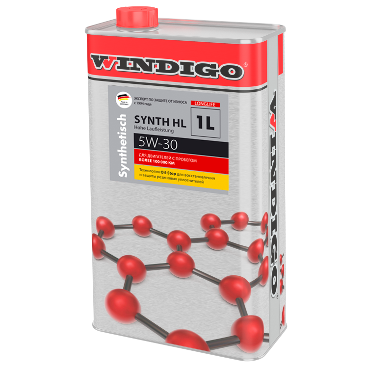 Это первое в мире синтетическое высокопроизводительное моторное масло нового поколения, класса вязкости SАE 5W-30 SN, которое восстанавливает эластичность резиновых уплотнений и предназначено для автомобилей с пробегом более 100 000 км. Состоит из синтетических базовых компонентов, отвечающих требованиям высокотехнологичных современных двигателей. Обеспечивает экономичный расход топлива в двигателях, высокую производительность и небольшие потери на испарение. Предназначено для легкового и малотоннажного транспорта. Максимальный интервал замены масла – 10 000км. Свойства WINDIGO SYNTH HL 5W-30– всесезонное полностью синтетическое моторное масло, разработанное на основе высококачественного синтетического базового масла новейшей технологии синтеза и современных высокопроизводительных присадок. Обеспечивает отличные пусковые качества и высокую надёжность смазывания при низких температурах. Помимо надежной защиты двигателя при экстремальных нагрузках и высоких температурах, при регулярном применении, масло WINDIGO безопасно и эффективно восстанавливает эластичность резиновых уплотнений, сальников, маслосъемных колпачков и других РТД, двигатель дольше не требует технического обслуживания и замены резинотехнических изделий. Тем самым исключается необходимость долива масла, из-за его утекания. Применение: Оптимально подходит для круглогодичного применения в любых бензиновых двигателях, в том числе оборудованных турбонаддувом и прямым впрыском, при любых рабочих условиях. Масло содержит уникальный, запатентованный комплекс присадок Oil-Stop от компании WAGNER Specialschmierstoffe. Соответствует допускам:SAE: 5W-30API: SNТехнические характеристики:Температура вспышки: 240 °CТемпература застывания: - 42 °CВязкость CSS при -35°C: 6200 мПа*сВязкость при +40°C: 62,33 мм?/сВязкость при +100°C: 11,00 мм?/сИндекс вязкости: 168 Сульфатная зола: 0,96 Щелочное число: 6,2 Интервал замены: 10000 км