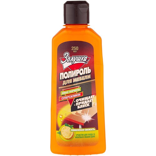 Полироль для мебели Золушка Лимонная свежестьНазначение:Средство предназначено для ухода за мебелью - полированной и неполированной, а также для чистки и придания блеска поверхностям из пластика, эмалированным поверхностям. Средство удаляет жирные пятна и грязь, позволяет скрыть царапины и освежает внешний вид. Формула, сочетающая воск и силикон, обеспечивает блеск и защиту от влаги, повышает стойкость поверхности к загрязнениям и пыли.Способ применения:Взболтайте. Нанесите немного средства на чистую ткань и равномерно разотрите по поверхности, затем располируйте до блеска сухой мягкой тканью. После этого дайте поверхности просохнуть 15-20 минут.Меры предосторожности:Беречь от детей. При попадании средства в глаза промыть большим количеством воды.Состав:>30% очищенная вода, <5% кпав, 5%-15% растворитель, <5% силиконовое масло, <5% воск, <5% консервант, <5% отдушка.Условия хранения:Хранить в сухом прохладном месте. Предохранять от попадания прямых солнечных лучей.Срок годности:2 года.