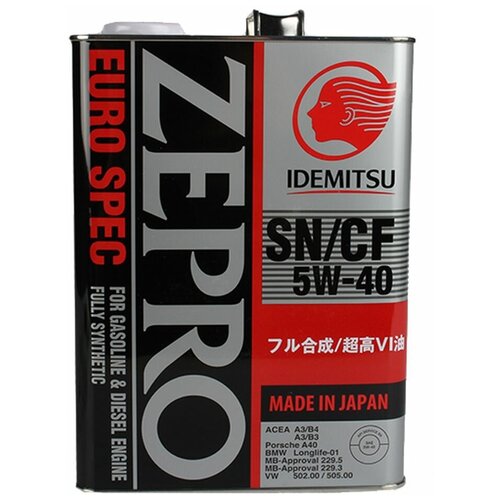 Высококачественное синтетическое моторное масло для четырехтактных форсированных бензиновых и дизельных двигателей легковых автомобилей, микроавтобусов, внедорожников, в том числе с турбонаддувом. Idemitsu Zepro EURO SPEC SN/CF 5W-40 произведен на основе синтетического базового масла с использованием запатентованной технологии Idemitsu Kosan Co Ltd. Данный продукт обладает высокими моющими свойствами, превосходными смазывающими характеристиками при высоких температурах и малым сопротивлением к проворачиванию коленчатого вала двигателя, в условиях низкотемпературного пуска. Idemitsu Zepro EURO SPEC SN/CF 5W-40 обеспечивает надёжную защиту современных двигателей и значительно продлевает ресурс каталитического нейтрализатора и сажевого фильтра легковых автомобилей, микроавтобусов и внедорожников. Соответствует спецификации: SAE 5W-40 Одобрено: API SN; асеа А3/В3-10; А3/В4-10 Porsche A40; BMW Longlife -01 MB 229.3;229.5; VW 502.00/505.00