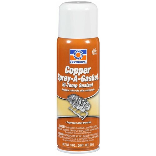 Уплотнитель-клей для прокладок термостойкий Permatex представляет собой аэрозольный клей и предназначен для облегчения ремонтных работ, связанных с уплотнением и герметизацией прокладок из любых материалов. Медная пудра хорошо рассеивает тепло, препятствует прогоранию прокладки и улучшает теплопередачу. Клей затекает и заполняет незначительные дефекты поверхности, обеспечивая полную герметичность при рабочих температурах от -45°С до +260°С. Кроме того, этот уплотнитель устойчив к воздействию большинства промышленных жидкостей, включая топливо. При демонтаже прокладка легко отделяется от поверхности.