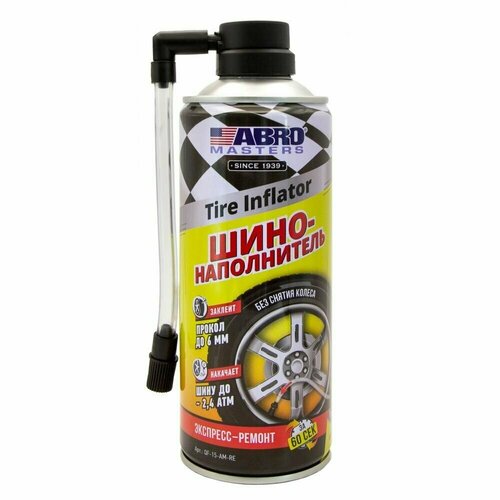 Шинонаполнитель в баллоне для экстренного ремонта шин. Сфера применения: предназначен для быстрого ремонта и накачки проколотых шин. Свойства: заклеивает большинство проколов до 6 мм и накачивает колесо за минуту; легок в использовании: не требует демонтажа и наличия специальных инструментов; подходит для использования на легковых и небольших грузовых автомобилях; не влияет на балансировку колеса; позволяет накачать шину до 240 кПа (2,4 атм); может использоваться для камерных и бескамерных шин.
