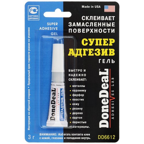 Суперадгезив-гель " Done Deal" быстро и надежно склеивает: металлы, керамику, пластик, резину, фарфор, кожу, дерево, картон, пористые материалы. Он обладает хорошей адгезией к замасленным, загрязненным и пористым поверхностям. Высоковязкая гелевая формула удобна для нанесения на вертикальные поверхности и склеивания пористых материалов. Непродолжительное время отвердевания позволяет значительно сократить и упростить технологические операции склеивания. Выдерживает воздействие высоких температур и большинства агрессивных жидкостей. Упаковка имеет вмонтированную в крышку пластиковую иголку, которая прочищает отверстие и предотвращает застывание клея. Состав: цианакрилат и добавки. Прочность соединения: 204 кг/см2. Время схватывания: 15 сек. Время отвердевания: 1 мин. Время полной полимеризации: 24 ч.