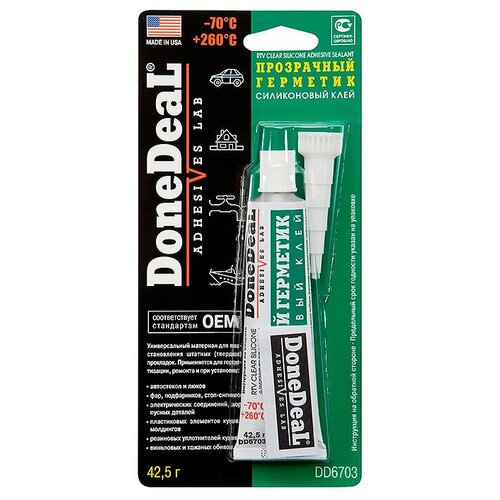 Прозрачный герметик силиконовый, клей DoneDeal.RTV — вулканизирующийся при комнатной температуре. Сохраняет эластичность и водостойкость. Рабочий диапазон температур: от -75°C до +235°C. Прозрачный, водонепроницаемый силиконовый герметик-клей широкого диапазона использования. Заполняет пустоты и неплотности. Используется для установки, ремонта и герметизации автомобильных стекол, люков и осветительных приборов, внутренних отделочных панелей, приборных досок. Благодаря высокой влагоустойчивости и широкому рабочему диапазону температур, может применяться снаружи, внутри и в подкапотном пространстве автомобиля.Используется как универсальный материал для замены штатных (твердых) прокладок. Обладает прекрасной адгезией к стеклу, пластику, металлу, резине, дереву, керамике. Выдерживает ударные и вибрационные нагрузки. Применяется при герметизации корпусов электрических приборов, проводов и контактов. Устойчив к действию агрессивных сред и автомобильных технических жидкостей.