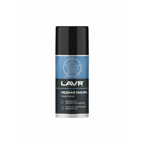 Смазка медная 210мл аэрозоль LAVRСмазка в формате аэрозоля с повышенным содержанием медного порошка предотвращает прикипание, сваривание и коррозию термонагруженных деталей. Применяется для обработки резьбовых соединений выхлопной и тормозной систем, болтов и шпилек ступиц колес, свечей зажигания и накаливания.Препятствует свариванию и прикипанию деталейЗащищает от влаги и препятствует коррозииСохраняет свойства в температурном диапазоне от -40 до +1100°СИмеет повышенное содержание медного порошкаОбладает высокой вязкостью и адгезиейРаспыляется равномерно и не растекается при нанесенииОбладает повышенной устойчивостью к воздействию окружающей средыТехнические характеристикиТип товара: смазкаОбласть применения: резьбовые соединенияТип смазки: меднаяПринцип действия: консервационная, проникающаяОбласть применения: резьбовые соединения, термонагруженные узлыМатериал основы: синтетическаяАгрегатное состояние: газообразнаяТип тары: аэрозольПеред применением тщательно встряхнуть. Для достижения наилучшего результата использовать при температуре баллона выше +10°С.По возможности очистить обрабатываемые поверхности от загрязненийРаспылить средство с расстояния 10 – 20 см на обрабатываемые поверхности тонким слоем.