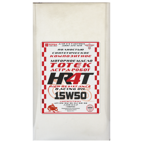 Моторное масло Астра Робот HR-4Т 15W50 1 л тотек HR4T1550001 полностью синтетическое термостойкое композитное моторное масло для 4-х тактных двигателей мотоциклов, создано на 100% синтетической основе ДиЭфир + ПАО Synthetic Technology. Превышает требования стандартов API SL/SJ/SH/SG; JASO MA. Предназначено для: Дорожных и внедорожных мотоциклов, эндуро, триал, оснащенных 4-х тактными двигателями с интегрированной и неинтегрированной коробкой скоростей и сцеплением, размещённым в масляной ванне или «сухим» в отдельном картере. Рекомендовано для двигателей, отвечающих требованиям норм EURO 2, EURO 3, ЕURO 4. Масло испытано и прошло апробацию в условиях кольцевых гонок Чемпионата России по кольцевым гонкам и на международных трассах, где показало преимущество пред используемыми в гонках зарубежными аналогами. Для идеального результата рекомендуется при замене масла использовать эффективные и безопасные промывочные масла тотек, далее опционально для мягкой и безшумной работы ДВС мотоцикла рекомендуется использовать тотек Астра Робот 1.