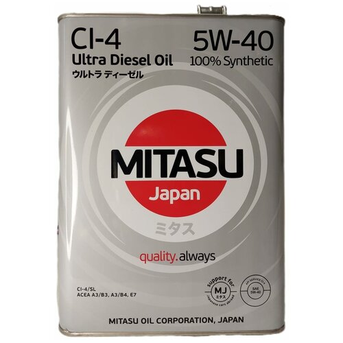 MITASU ULTRA DIESEL CI-4 5W-40 100% Synthetic – полностью синтетическое дизельное масло, произведенное с применением специального пакета присадок высшего класса, обладающее повышенным щелочным числом для нейтрализации вредного влияния серы, содержащейся в дизельном топливе низкого качества.применениеMITASU ULTRA DIESEL CI-4 5W-40 100% Synthetic рекомендуется для всесезонного использования в современных высокофорсированных дизельных двигателях легковых автомобилей, микроавтобусов, SUV и легких грузовиков как с турбонаддувом, так и без него. Обеспечивает лёгкий старт, сохраняя текучесть при низких температурах окружающей среды. Высокие эксплуатационные и экологические характеристики продукта отвечают современным требованиям API.спецификации / допуски∙ API CI-4/CH-4/СG-4/CF∙ ACEA A3/B3, A3/B4, E7преимуществаПолностью синтетическое дизельное масло MITASU ULTRA DIESEL CI-4 5W-40 100% Synthetic обеспечивает:∙ Прочную масляную пленку на деталях двигателя в тяжелых условиях эксплуатации∙ Значительное увеличение интервала между заменами масла∙ Легкий запуск двигателя при температурах до – 42 °C∙ Высокую стойкость к окислениюНовейшие технологии MITASU OIL CORPORATION, Japan позволяют выпускаемым компанией моторным маслам превосходить требования таких производителей автомобилей, как: TOYOTA, NISSAN, MITSUBISHI, MAZDA, ISUZU, HYUNDAI, KIA, FORD, GM, VW, FIAT, VOLVO, AUDI, MERCEDES-BENZ, RENAULT и других.