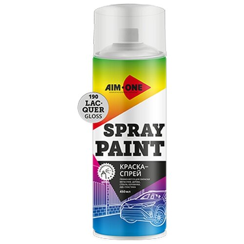 ОписаниеSpray paint lacquer gloss mdash; акриловый лак глянцевый, предназначенн для финишного окрашивания металлических, стеклянных, деревянных, керамических поверхностей, а также ABS-пластика. Продукт может использоваться в процессе ремонта автомобиля, в быту и других сферах. Спрей предлагается в удобном баллоне объемом 450 мл с качественным распылителем.преимущества краски AIM-ONE:универсальное применение (для разных типов поверхностей);качественное распыление;отличная адгезия;быстро высыхает;устойчивость к негативным атмосферным воздействиям.удобная И долговечная краскаАэрозоль Spray paint легко наносится нажатием на кнопку баллона. Краска быстро и крепко ложится на обрабатываемую поверхность. Распылитель Aim-One обеспечивает высокую скорость и точность нанесения. Кроме того, достигается экономный расход спрея.Полученный после нанесения слой прочен и долговечен: он стойко выдерживает солнечное излучение, атмосферные осадки, легкие удары, давление и трение. Краска Spray paint lacquer gloss образует на поверхности ровный глянцевый слой. Материал не подвержен выцветанию и коррозии.Способ примененияОчистите обрабатываемую поверхность и смежные участки от пыли, влаги, жира и масла, коррозииТщательно взболтайте баллон в течение 2 минутПредварительно проверьте соответствие выбранного цвета, для этого нанесите краску на небольшой участок обрабатываемой поверхностиНачните покраску поверхности mdash; краску следует наносить на расстоянии 15-30 см равномерно перекрывающимися полосами, избегая потековЕсли краска из баллона выходит с избытком, поверните головку распылителя на 180 градусов