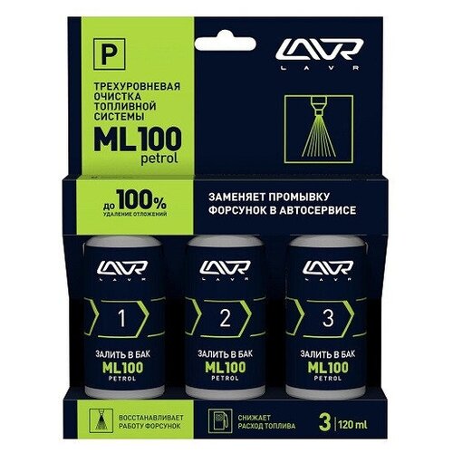 Трехуровневый очиститель топливной системы ML100 PETROL для бензиновых двигателей – это три уникальные присадки, которые заменят промывку форсунок в автосервисе и удалят до 100% загрязнений.Просто залейте составы последовательно в бак и забудьте, что такое- трудный запуск- неровная работа двигателя- повышенный расход топлива- провалы на холостых и малых оборотах- рывки при разгоне- ухудшение динамики- дымность.Рецептура и концентрация подобраны идеально. Состав №1 безопасно удалит рыхлые загрязнения, смягчит нагары на клапанах и форсунках. Состав №2 с запатентованными компонентами LAVR ISP/DET™ удалит лаковые и смолистые отложения, а состав №3 завершит процедуру качественной очистки и защитит от появления новых загрязнений. Трехуровневый очиститель топливной системы ML100 для бензиновых двигателей создан на основе легендарного препарата для промывки систем впрыска ML101 EURO. Он работает эффективней аналогов за счет поэтапного очищения. Как результат- 100% восстановление факела распыла- стабилизация компрессии- легкий холодный запуск- меньший, гораздо меньший расход топлива- улучшение динамики.Уникальный состав LAVR ML100 подходит для всех типов систем впрыска бензиновых двигателей. Рекомендуется проводить трехуровневую очистку топливной системы каждые 20-30 000 км пробега.