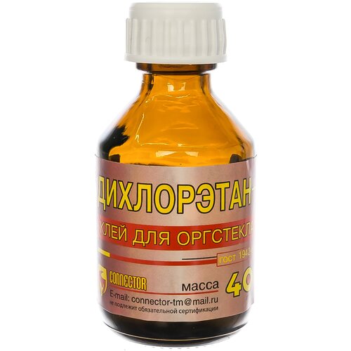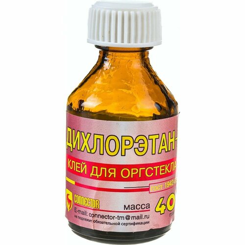 Дихлорэтан клей для пластмассы Connector 40 г DIX-40 служит для высокопрочного соединения изделий из оргстекла и некоторых других пластиков. Продукт представляет собой бесцветную летучую жидкость, которая отличается специфическим запахом.