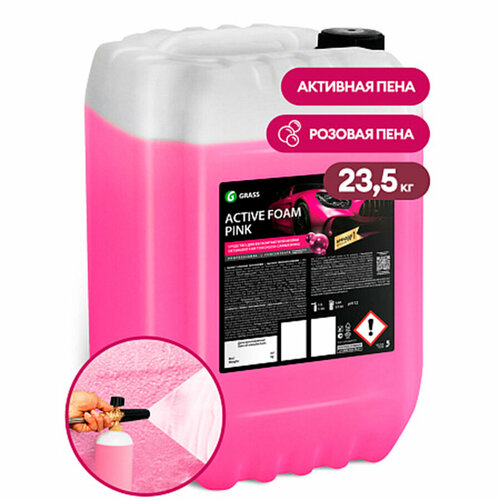 Активная пена Grass «Active Foam Pink» - высокопенное концентрированное щелочное средство для бесконтактной мойки любого автотранспорта. Легко удаляет дорожную грязь, пыль, масло, следы от насекомых. Создает стойкую обильную пену, которая легко смывается с поверхности. Наносится с помощью пенораспылителя, придает блеск, не причиняет вреда лакокрасочным поверхностям. Обладает эффектом снежных хлопьев, пена окрашена в розовый цвет. Свойства:- Дозировка:- пеногенератор 1:50-1:100,- пенокомплект 1:2-1:7- Рекомендуемый расход на а/м: 40-80 гСпособ применения:1. Перед нанесением средство необходимо разбавить с водой из расчета 10-20 г/л для пеногенератора (25, 50, 100 л) или 125-350 г в пенокомплект (1 л), в зависимости от времени года и степени загрязнения.2. Сбить с загрязненной поверхности верхний слой грязи, после чего нанести разбавленный состав снизу вверх для избегания подтеков.3. Выдержать 1-2 мин, не допуская высыхания!4. Тщательно смыть водой под высоким давлением с близкого расстояния 10-15 см. снизу вверх. Расход на одну легковую машину должен составлять 40-80 г концентрата. Состав: вода, неиогенные, анионные, амфотерные поверхностно-активные вещества, гидроксид натрия, активные добавки, смесь комплексообразователей, краситель.