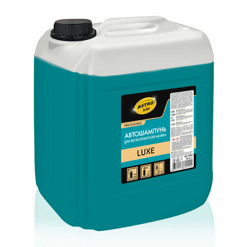Автошампунь для бесконтактной мойки ASTROhim LUXE 23кг - высококонцентрированный автошампунь для бесконтактной мойки автомобилей и любых транспортных средств. Подходит для мойки с использованием любого оборудования (пеногенератора, мойки высокого давления, систем дозирования), а также воде разной жесткости. Эффективно и бережно удаляет дорожные загрязнения, остатки насекомых и масляную пленку. Обладает обильным пенообразованием, легко смывается с поверхности, не оставляя разводов. Безвреден для ЛКП, пластика, отделки из сплавов цветных металлов и резины при соблюдении инструкции по применению. Содержит антикоррозийные добавки.Характеристики: Тип: автошампунь для бесконтактной мойки Тара: канистра Объем, кг: 23Рекомендации по применению: разведите автошампунь водой в соответствии с рекомендованной пропорцией и степенью загрязнения поверхности. Пропорция Оборудование Примечание 1:80 1:100 Для пеногенератора При использовании подачи моющего раствора с помощью сжатого воздуха рекомендуемая концентрация средства в рабочем растворе составляет 1:80 1:100 1:7 1:10 Для пенокомплекта При использовании инжекторной подачи моющего раствора рекомендуемая концентрация средства 1:7 1:10