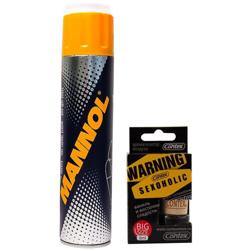 Каждый автовладелец при покупке новенького авто прекрасно помнит то чувство, когда кузов машины идеально чистый, а салон ухоженный и опрятный. Постепенно в салоне накапливается грязь, которая существенно ухудшает нахождение в автомобиле. Поддерживать идеальную чистоту и создать в салоне более уютную и комфортную атмосферу Вам поможет очиститель салона автомобиля MANNOL в комплекте с ароматизатором для автомобиля CONTEX WARNING SEXOHOLIC!Пена высокоэффективно очистит ваш салон или обивку мебели от разнообразных загрязнений и пятен с ковровых покрытий, тканей и т. д. Химчистка салона автомобиля возвратит естественный цвет, восстановит первоначальный внешний вид тканей и ковровых материалов, поднимет ворс, а также он сможет устранить неприятные запахи и освежит воздух в машине и в доме.На крышке очистителя находится щетка, с её помощью выполнить качественную уборку станет еще проще и эффективнее. Предупреждает повторное загрязнение благодаря антистатическим свойствам.Ароматизатор для автомобиля CONTEX станет завершающим этапом уборки, который наполнит салон приятным ароматом чистоты и свежести.Утонченный дизайн и приятный аромат, что еще необходимо для настоящего любителя изысканных вкусов? Очень приятный, нежный аромат, не теряет своих свойств на протяжении длительного времени. Нежные нотки ванили смогут придать Вашему салону легкость, сладкий привкус летнего вечера. А аромат восточных сладостей заставит Вас погрузиться в мечтания о теплых странах Востока.Ароматизатор в виде спрея отлично позволяет использовать его не только в салоне автомобиля, но и дома, в офисе, в любом закрытом помещении. Также его очень удобно носить с собой. Удобство ароматизатора - спрея заключается в том, что интенсивность и расход можно регулировать самостоятельно.Преимущества сухой химчистки:Легкость в нанесении и в удалении;Высокоэффективно и деликатно удаляет разнообразные загрязнения;Возвращает естественный цвет;Восстанавливает внешний вид тканей;Поднимает ворс;Устраняет неприятные запахи;Имеет приятный аромат;Предупреждает повторное загрязнение;Удобная в использовании щетка;Большой объем;Удобен в применении.Преимущества ароматизатора:Компактный;Оригинальный дизайн;Удобство в использовании;Практичность;Стойкий аромат;Не содержит токсины;Соотношение цена/качество;Ненавязчивый приятный аромат ванили и восточных сладостей.