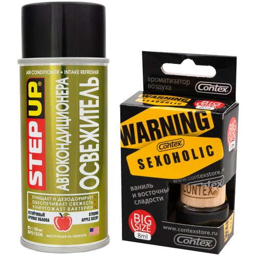 Многие автовладельцы сталкивались с неприятным запахом в автомобиле при включении кондиционера. Появление неприятного запаха может быть связано с накоплением пыли и грязи, а также может быть вызвано размножением бактерий, которые в свою очередь негативно влияют на здоровье человека. Шашка для кондиционера STEPUP поможет Вам эффективно и без разборки очистить систему кондиционирования!Очиститель кондиционера автомобиля STEPUP – это профессиональное средство, для эффективной очистки и дезодорирования узлов и деталей автокондиционера. Очиститель качественно уничтожает накопившиеся в кондиционере вредные вирусы, бактерии и другие микроорганизмы. После применения очистителя из кондиционера поступает чистый и свежий воздух.С помощью ароматизатора дерево CONTEX THE SEX MAFIA Вы дополните эффект от очистки системы вентиляции и сможете обновить аромат в салоне, наполнив его древесно-цветочной свежестью.Из-за удобной формы Вы сможете сами выбрать, где расположить данный ароматизатор. Этот ароматизатор безопасен при использовании на постоянной основе.Преимущества комплекта:Доступная цена;Ароматизатор создаст приятную атмосферу в салоне автомобиля;Комплект из очистителя кондиционера и ароматизатора вернет Вашему салону свежесть;С помощью ароматизатора Вы наполните салон ароматом древесно-цветочной свежести;С помощью очистителя Вы эффективно и быстро устраните неприятные запахи, бактерии, грибковую плесень и причину их появления в будущем.Легкость в применении: очиститель используется без демонтажа салонного фильтра и разборки системы кондиционирования, а сама процедура очистки не займет много времени;Способ применения:1. Закройте окна и двери в автомобиле. Проследите, чтобы в салоне не было людей, животных и личных вещей.2. Включите двигатель и кондиционер, установите заслонки в положение «открытая система», вентилятор – на максимум.3. Для удаления влаги дайте поработать системе в этом режиме 5 минут.4. Включите режим рециркуляции.5. Энергично встряхните баллон.6. Во избежание попадания состава на потолок и обивку салона установите и закрепите баллон на полу рядом с воздухозаборником системы рециркуляции воздуха.7. Нажмите на фиксатор распылителя до щелчка, покиньте салон и закройте двери.8. Через 10–15 минут откройте двери автомобиля для проветривания.9. Установите переключатель заслонок в положение «открытая система», и заглушите двигатель.10. Автомобиль может эксплуатироваться только после полного проветривания.! Рекомендуется применять не реже одного раза в год, а также в период обострения вирусных заболеваний.
