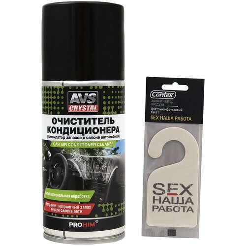 Система кондиционирования автомобиля нуждается в периодической очистке и обслуживании для предотвращения её загрязнения и появления неприятных запахов в салоне авто. Очиститель кондиционера автомобиля AVS поможет Вам эффективно удалить загрязнения и восстановить свежий чистый воздух в салоне авто!Очиститель автокондиционера эффективно справляется с устранением накопившихся в испарителе вредных микроорганизмов, осуществляет дезинфекцию испарителей и воздушных каналов автомобильных кондиционеров.После обработки очистителем испаритель кондиционера формирует устойчивую защитную дезинфицирующую пленку на обрабатываемой поверхности. Благодаря образуемой пленке затрудняется накопление и размножение вредных микроорганизмов в системе кондиционирования автомобиля.Одним из главных преимуществ очистителя кондиционера AVS является отсутствие необходимости демонтажа салонного фильтра и разборки системы кондиционирования.После применения очистителя воздух в салоне автомобиля приобретает былую свежесть.С ароматизатором CONTEX SEX наша работа Вы сможете дополнить эффект от очистки кондиционера и наполнить салон автомобиля утренним концертом из цветочных и фруктовых запахов с восточными оттенками.Преимущества комплекта:Прост в применении;Быстро и эффективно устраняет неприятный запах;Обладает бактерицидным и дезодорирующим действием;Салон Вашего автомобиля долговечной свежестью, а аромат эйфории цветов и фруктов подарит Вам приятные и яркие эмоции от вождения;Используется без демонтажа салонного фильтра и разборки системы кондиционирования;Восстанавливает свежий и чистый воздух в салоне автомобиля;Создает приятную атмосферу в салоне автомобиля, за счет содержания в составе натуральных эфирных масел ментола и эвкалипта.