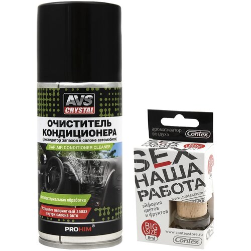 Система кондиционирования автомобиля нуждается в периодической очистке и обслуживании для предотвращения её загрязнения и появления неприятных запахов в салоне авто. Очиститель кондиционера автомобиля AVS поможет Вам эффективно удалить загрязнения и восстановить свежий чистый воздух в салоне авто!Очиститель автокондиционера эффективно справляется с устранением накопившихся в испарителе вредных микроорганизмов, осуществляет дезинфекцию испарителей и воздушных каналов автомобильных кондиционеров.После обработки очистителем испаритель кондиционера формирует устойчивую защитную дезинфицирующую пленку на обрабатываемой поверхности. Благодаря образуемой пленке затрудняется накопление и размножение вредных микроорганизмов в системе кондиционирования автомобиля.Одним из главных преимуществ очистителя кондиционера AVS является отсутствие необходимости демонтажа салонного фильтра и разборки системы кондиционирования.После применения очистителя воздух в салоне автомобиля приобретает былую свежесть.С ароматизатором CONTEX SEX наша работа Вы сможете дополнить эффект от очистки кондиционера и наполнить салон автомобиля утренним концертом из цветочных и фруктовых запахов с восточными оттенками и приведет в восторг любого, кто сядет к Вам в автомобиль. А тонкие нотки свежескошенной травы и пахучего высушенного сена перенесут Вас в яркий солнечный летний день.Преимущества комплекта:Прост в применении;Быстро и эффективно устраняет неприятный запах;Обладает бактерицидным и дезодорирующим действием;Салон Вашего автомобиля наполнится утренним концертом из цветочных и фруктовых запахов с восточными оттенками.Используется без демонтажа салонного фильтра и разборки системы кондиционирования;Восстанавливает свежий и чистый воздух в салоне автомобиля;Создает приятную атмосферу в салоне автомобиля, за счет содержания в составе натуральных эфирных масел ментола и эвкалипта.