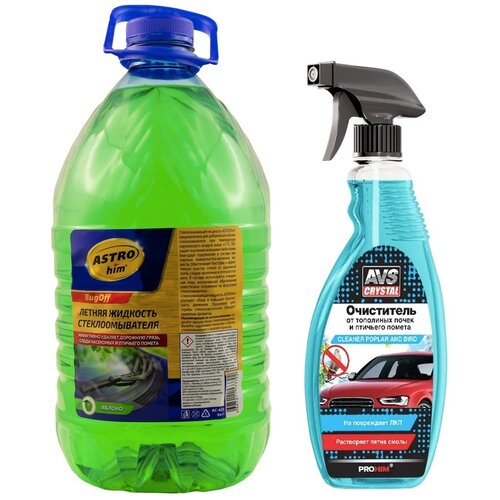 Загрязнения лобового стекла автомобиля считаются злободневной проблемой каждого автовладельца, а с наступлением теплого времени года ко всему добавляются еще следы от насекомых, затрудняющие обзор дороги. Если Вы дорожите комфортом при вождении и хотите, чтобы стекла Вашего авто были кристально чистыми, то Вам на помощь придет летний омыватель стекол ASTROHIM, а с очистителем AVS кузов Вашего автомобиля станет как новый!Летний стеклоомыватель Astrohim обладает высокими моющими свойствами благодаря содержанию в составе импортных поверхностно-активных веществ и эффективно справляется с очисткой лобового стекла от грязи, следов насекомых, птичьего помета и т. д. В составе жидкости стеклоомывателя используется очищенная вода, что исключает образование известковых отложений на форсунках стеклоомывателя.Стеклоомыватель снижает амортизацию щеток стеклоочистителя и продлевает срок их службы.С очистителем кузова AVS Вы сможете с легкостью справиться с удалением следов птичьего помета, смолы деревьев, тополиных почек с поверхностей автомобилей, мотоциклов, велосипедов и другой техники. Состав средства не вредит лакокрасочным покрытиям, резиновым и пластиковым деталям. Он тщательно очищает стекла, фары, решетки радиатора, бампера и хромированные детали.Преимущества комплекта:Качественный состав;Легкость применения;Обладает приятным ароматом;Продлевает срок службы стеклоочистителей;Повышает безопасность дорожного движения;Идеально очищает лобовое стекло от следов насекомых, птичьего помета и грязи;Обладает высокими моющими свойствами благодаря содержанию в составе импортных поверхностно-активных веществ;В составе используется очищенная вода, исключающая образование известковых отложений на форсунках стеклоомывателя.Очиститель удаляет следы птичьего помета, смолы деревьев, тополиных почек с поверхностей;Очиститель безопасен для лакокрасочного покрытия, стекол, резиновых и пластиковых деталей;Не оставляет разводов.