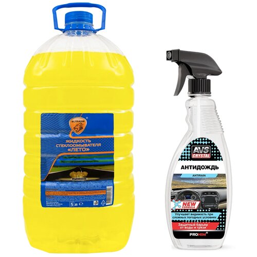 Загрязнения лобового стекла автомобиля считаются злободневной проблемой каждого автовладельца, а с наступлением теплого времени года ко всему добавляются еще следы от насекомых, затрудняющие обзор дороги. Если Вы дорожите комфортом при вождении и хотите, чтобы стекла Вашего авто были кристально чистыми, то Вам на помощь придет летний омыватель стекол ELTRANS и антидождь AVS!Готовый раствор омывающей жидкости ELTRANS – это готовое к применению качественное средство, которое эффективно и быстро удаляет дорожную грязь, следы насекомых и птичьего помета со стекол автомобиля, тем самым улучшая обзорность и повышая безопасность движения. В состав омывайки входит очищенная вода, которая исключает образование известковых отложений на форсунках стеклоомывателя, продлевая срок службы стеклоочистителей.Благодаря использованию современных поверхностно-активных веществ в составе, обладающих высокой моющей способностью, средство обеспечивает удаление стойких загрязнений, в том числе органического происхождения. Стеклоомывающая жидкость безопасно для всех типов лакокрасочного покрытия, резины и пластика.Омывайка обладает приятным и ненавязчивым ароматом лимона.С антидождем AVS стекла Вашего автомобиля будут дольше оставаться чистыми. Антидождь придает водооталкивающие свойства стеклам, зеркалам, фарам, пластиковым визорам и мотоциклетным шлемам. Он образует стойкую полимерную пленку, которая значительно снижает сцепление водяных капель или грязи с поверхностью, поэтому даже в непогоду Вам будет обеспечена нормальная видимость.Преимущества:Улучшает обзорность;Проста в использовании;Не оставляет бликов и разводов;Повышает безопасность движения;Обладает приятным ароматом лимона;Продлевает срок службы стеклоочистителей;Облегчает движение щеток стеклоочистителя;Эффективно удаляет дорожную грязь, следы насекомых и птичьего пометаБезопасна для всех типов лакокрасочного покрытия, резины и пластика.Благодаря очищенной воде в составе исключает образование известковых отложений на форсунках стеклоомывателя.При скорости выше 60 км/ч водяные капли скатываются, оставляя стекло прозрачным;Антидождь применяется на стеклах, зеркалах, фарах, пластиковых визорах мотоциклетных шлемов;Антидождь образует полимерную пленку, которая значительно снижает сцепление водяных капель или грязи с поверхностью.