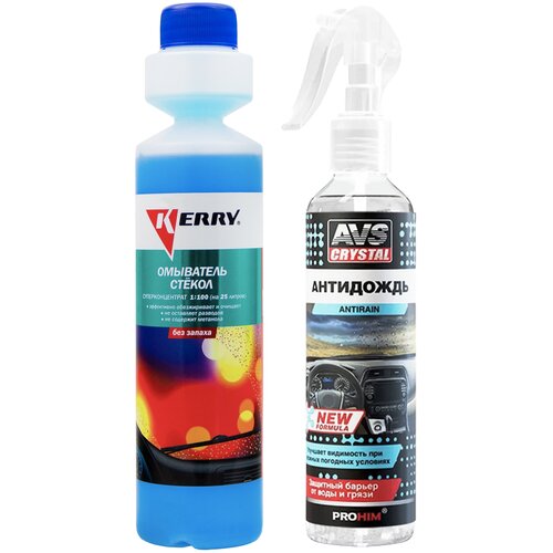 Жидкость стеклоомывателя летняя 270 мл KERRY / омывающая жидкость без запаха (омывайка летняя), суперконцентрат + Антидождь для автомобиля New Formula 250мл. AVS AVK-664 KR-336/A07592S