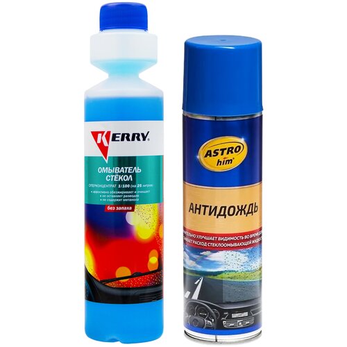 Жидкость стеклоомывателя летняя 270 мл KERRY / омывающая жидкость без запаха (омывайка летняя), суперконцентрат + Антидождь для стекол и зеркал автомобиля (защитный спрей для лобового стекла с эффектом антидождя) ASTROHIM - 355 мл; KR-336/АС-893