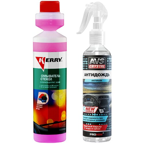 Жидкость стеклоомывателя летняя 270 мл KERRY / омывающая жидкость с ароматом лесных ягод (омывайка летняя), суперконцентрат + Антидождь для автомобиля New Formula 250мл. AVS AVK-664; KR-337/A07592S