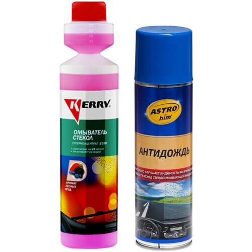 Жидкость стеклоомывателя летняя 270 мл KERRY / омывающая жидкость с ароматом лесных ягод (омывайка летняя), суперконцентрат + Антидождь для стекол и зеркал автомобиля (защитный спрей для лобового стекла с эффектом антидождя) ASTROHIM 355 мл KR-337/АС-893