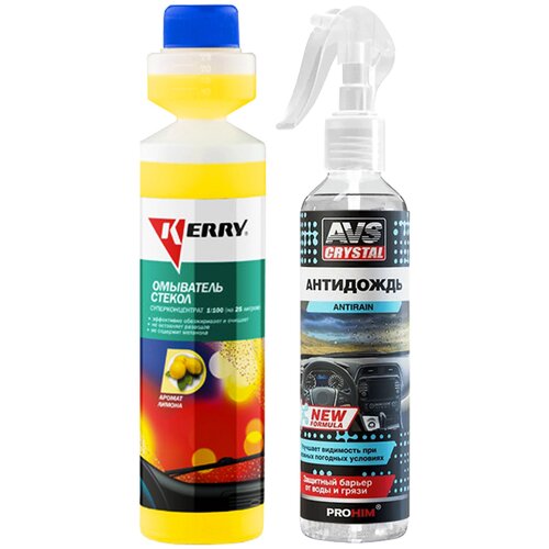 Загрязнения лобового стекла автомобиля считаются злободневной проблемой каждого автовладельца, а с наступлением теплого времени года ко всему добавляются еще следы от насекомых, затрудняющие обзор дороги. Если Вы дорожите комфортом при вождении и хотите, чтобы лобовое стекло Вашего авто было кристально чистым, то Вам на помощь придет летний омыватель стекол концентрат KERRY и антидождь AVS!Содержащиеся в составе концентрата поверхностно-активные добавки, обладающие высокой моющей способностью с легкостью справляются с удалением дорожной грязи, масляных пятен, следов насекомых, птичьего помета, смолы растений.Использование жидкости стеклоомыватель KERRY обеспечивает идеальную чистоту фар, лобового и заднего стекол автомобиля. Омыватель улучшает обзор во время движения и не оставляет разводов и радужной пленки. Он безвреден для лакокрасочных покрытий, резиновых и пластиковых деталей. С антидождем AVS стекла Вашего автомобиля будут дольше оставаться чистыми. Антидождь придает водооталкивающие свойства стеклам, зеркалам, фарам, пластиковым визорам и мотоциклетным шлемам. Он образует стойкую полимерную пленку, которая значительно снижает сцепление водяных капель или грязи с поверхностью, поэтому даже в непогоду Вам будет обеспечена нормальная видимость.. Преимущества:: Улучшает обзор;; Бутылка с дозатором;; Не содержит метанола;; Не оставляет разводов;; Не оставляет радужной пленки;; Имеет приятный аромат лимона;;1 флакон рассчитан на 25 л. воды;; Суперконцентрированный состав;; Повышает безопасность движения;; Эффективно обезжиривает и очищает;; Предохраняет стекла и щетки от абразивного износа;; Безопасен для лакокрасочных покрытий, резиновых и пластиковых деталей;; Обеспечивает идеальную чистоту фар, лобового и заднего стекол автомобиля.. При скорости выше 60 км/ч водяные капли скатываются, оставляя стекло прозрачным;; Антидождь применяется на стеклах, зеркалах, фарах, пластиковых визорах мотоциклетных шлемов;; Антидождь образует полимерную пленку, которая значительно снижает сцепление водяных капель или грязи с поверхностью.