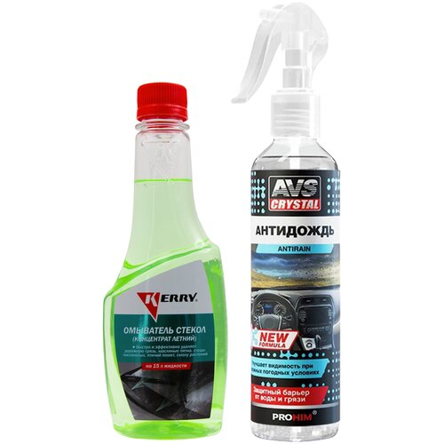 Загрязнения лобового стекла автомобиля считаются злободневной проблемой каждого автовладельца, а с наступлением теплого времени года ко всему добавляются еще следы от насекомых, затрудняющие обзор дороги. Если Вы дорожите комфортом при вождении и хотите, чтобы лобовое стекло Вашего авто было кристально чистым, то Вам на помощь придет летний омыватель стекол концентрат KERRY и антидождь AVS!Содержащиеся в составе концентрата поверхностно-активные добавки, обладающие высокой моющей способностью с легкостью справляются с удалением дорожной грязи, масляных пятен, следов насекомых, птичьего помета, смолы растений. Использование жидкости стеклоомыватель KERRY обеспечивает идеальную чистоту фар, лобового и заднего стекол автомобиля. Омыватель улучшает обзор во время движения и не оставляет разводов и радужной пленки. Он безвреден для лакокрасочных покрытий, резиновых и пластиковых деталей. Концентрат стеклоомывателя разработан для стеклоомывателей российских и иностранных автомобилей всех марок. Одного флакона достаточно для приготовления 15 литров стекоомывающей жидкости. С антидождем AVS стекла Вашего автомобиля будут дольше оставаться чистыми. Антидождь придает водооталкивающие свойства стеклам, зеркалам, фарам, пластиковым визорам и мотоциклетным шлемам. Он образует стойкую полимерную пленку, которая значительно снижает сцепление водяных капель или грязи с поверхностью, поэтому даже в непогоду Вам будет обеспечена нормальная видимость. Преимущества:Улучшает обзор;Не содержит метанола;Не оставляет разводов;Концентрированный состав;Экономична в использовании;Не оставляет радужной пленки;1 флакон рассчитан на 15 л. воды;Повышает безопасность движения;Эффективно обезжиривает и очищает;Предохраняет стекла и щетки от абразивного износа;Безопасен для лакокрасочных покрытий, резиновых и пластиковых деталей;Обеспечивает идеальную чистоту фар, лобового и заднего стекол автомобиля.При скорости выше 60 км/ч водяные капли скатываются, оставляя стекло прозрачным;Антидождь применяется на стеклах, зеркалах, фарах, пластиковых визорах мотоциклетных шлемов;Антидождь образует полимерную пленку, которая значительно снижает сцепление водяных капель или грязи с поверхностью.Способ применения концентрата:1. Разбавить концентрат в 40-50 раз (20-25 мл продукта на 1 литр воды)2. Разбавление можно проводить непосредственно в бачке стеклоомывателя